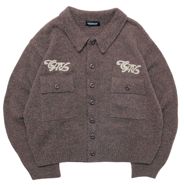 -     KNIT JACKET <BROWN> ¥19,800 ・襟付きニットジャケット。 ・胸にウール糸でロゴをチェーンステッチで表現。 ・両胸にポケットを配置。 ・首後ろに刻印レザータグを縫い付け。 model men 177cm XXL women 152cm M