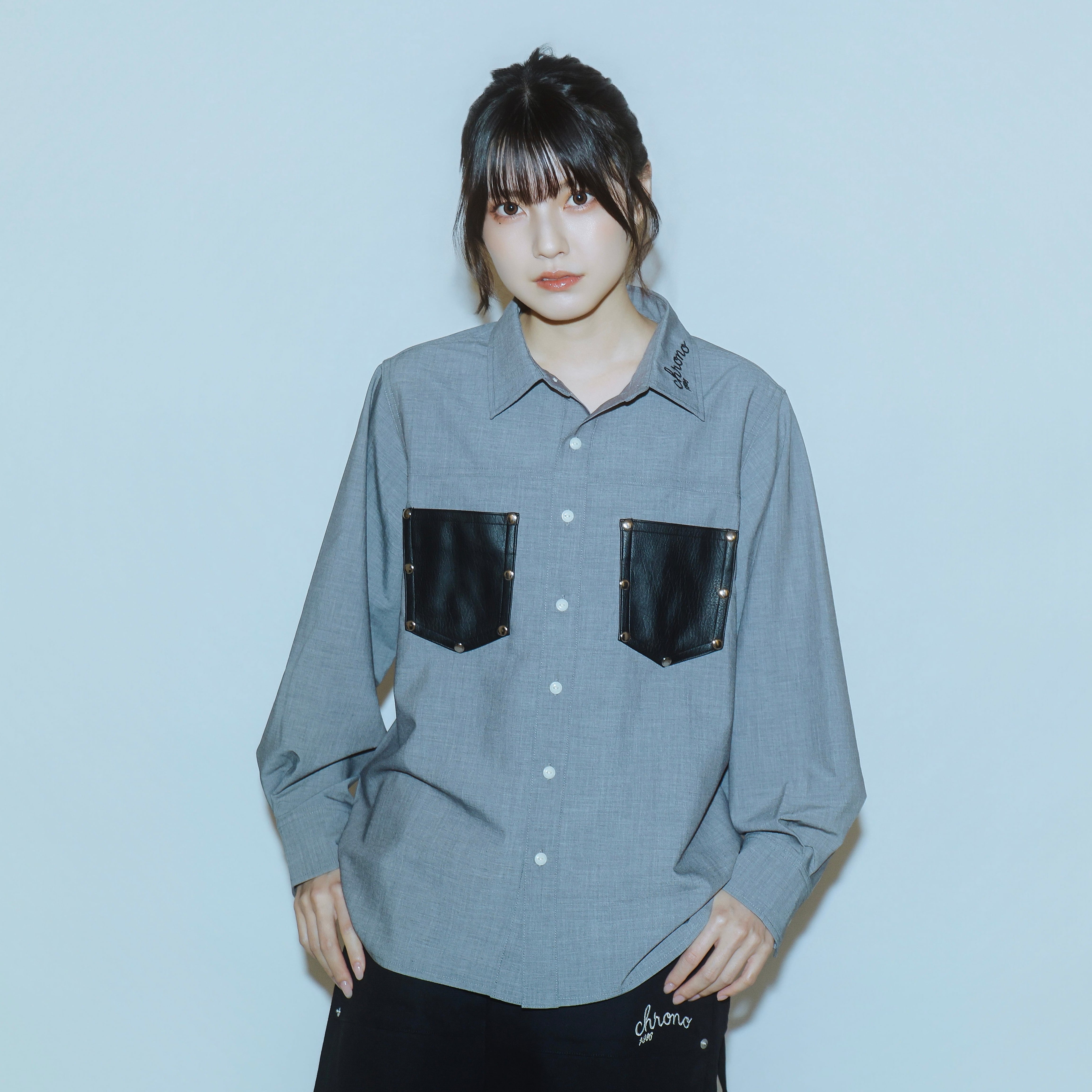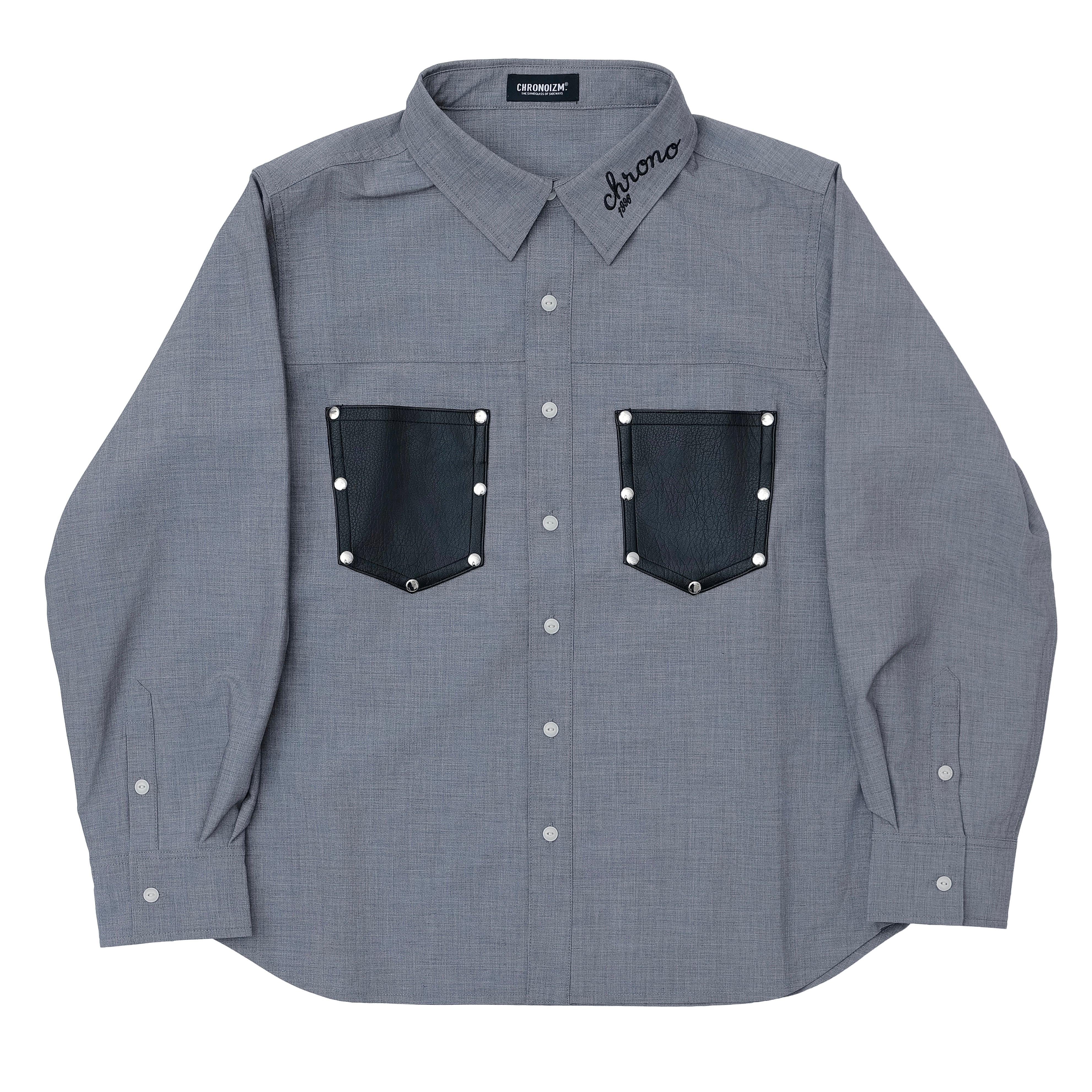 ・シボ加工を施したヴィーガンレザーに、スタッズをあしらったポケットを配置したシャツ。