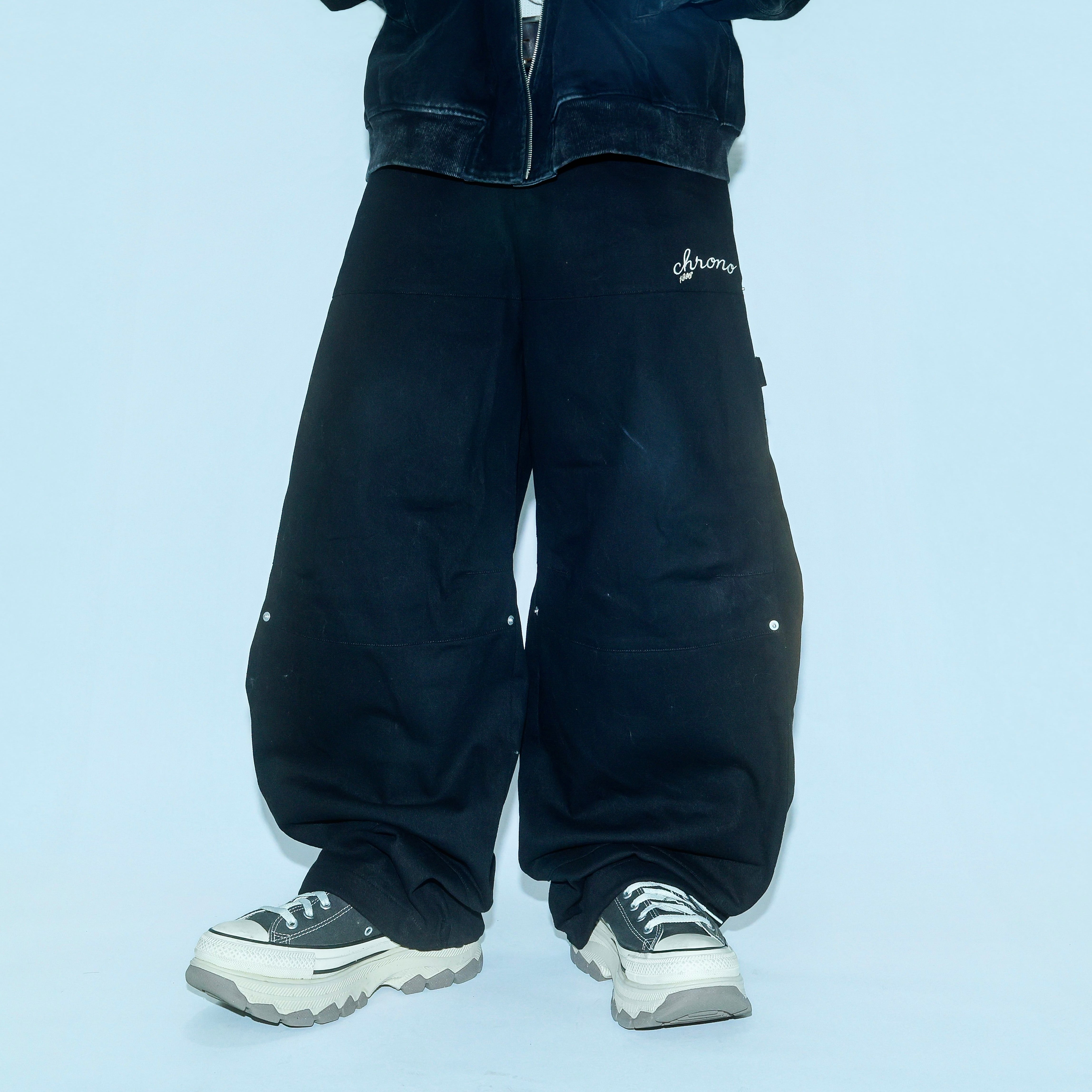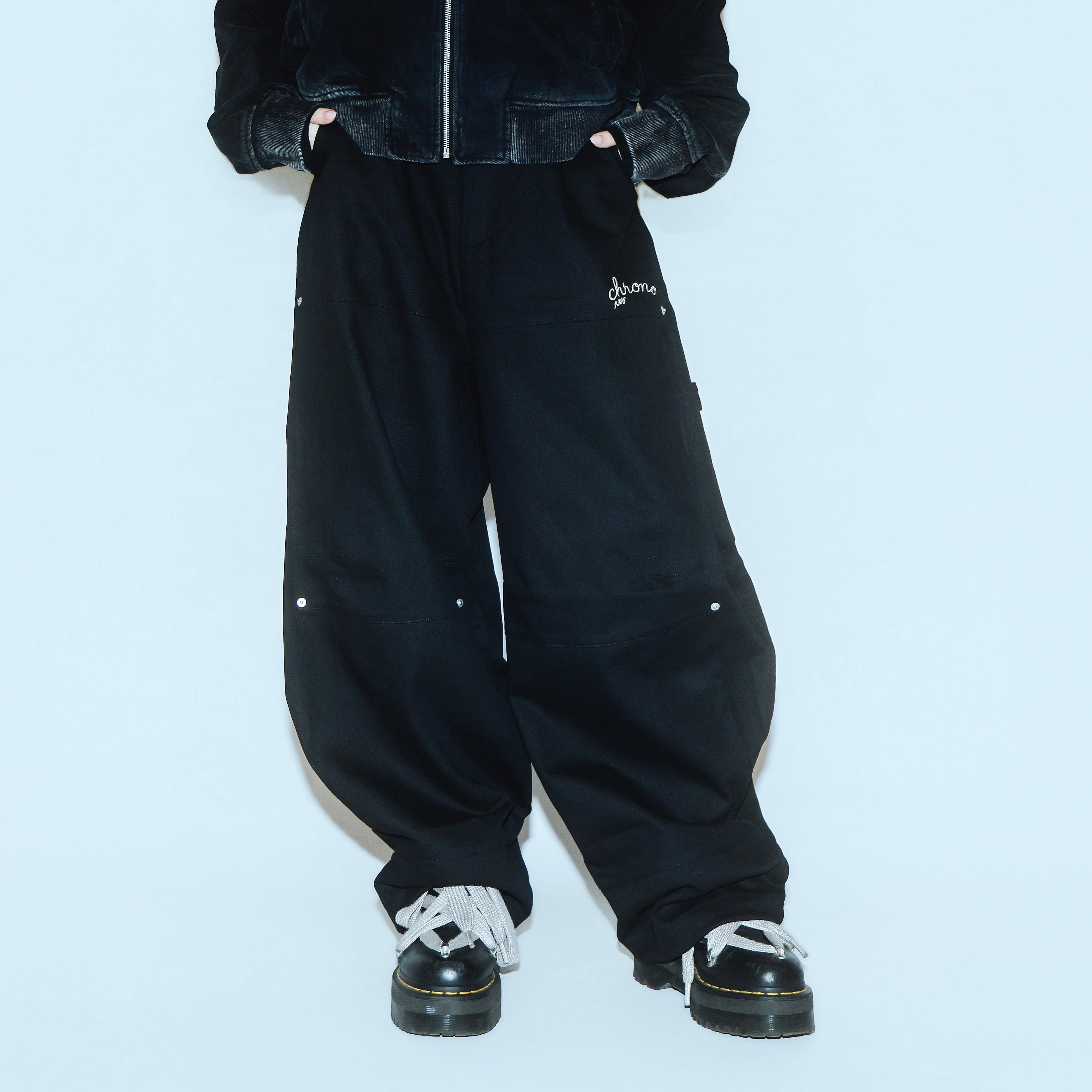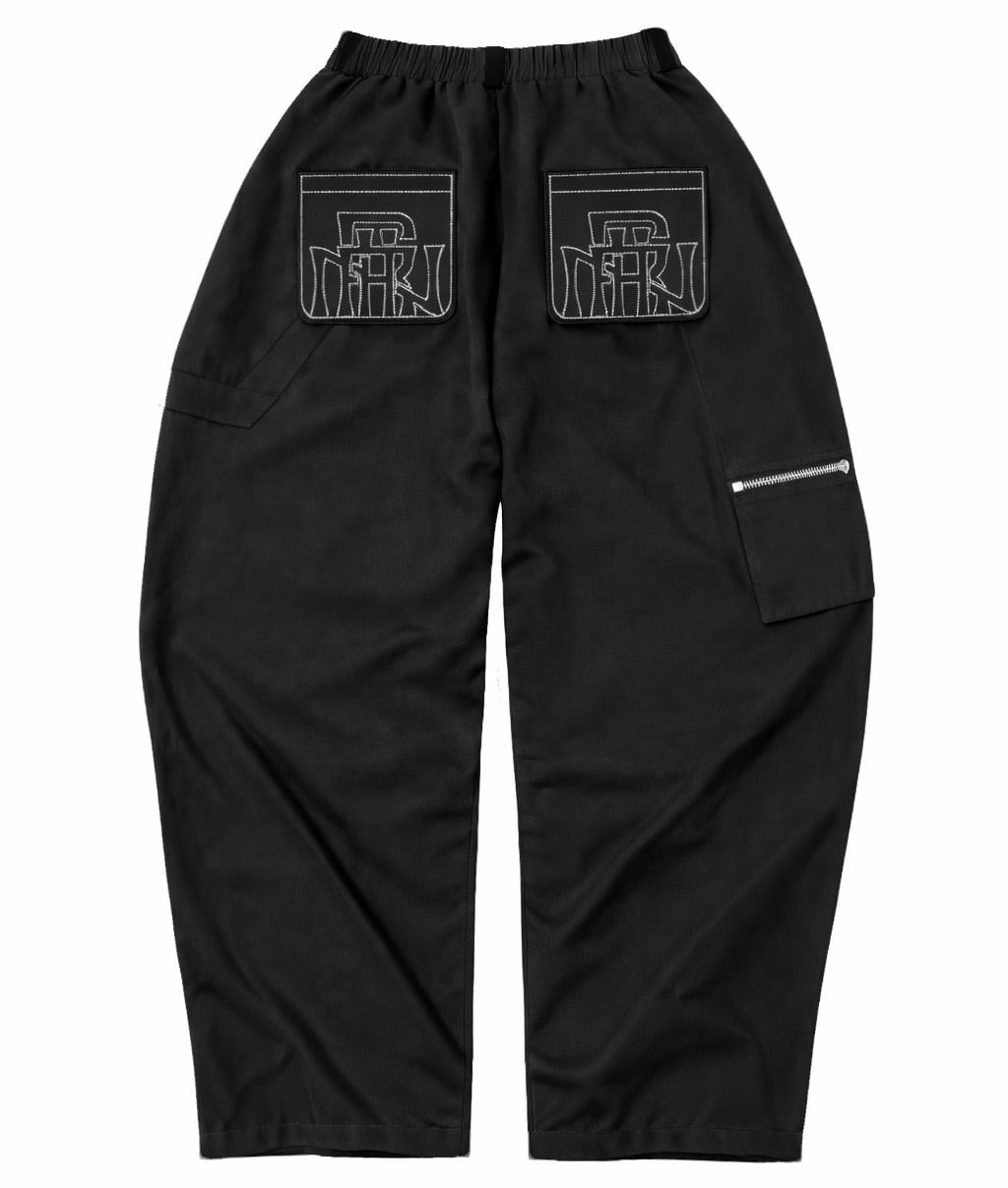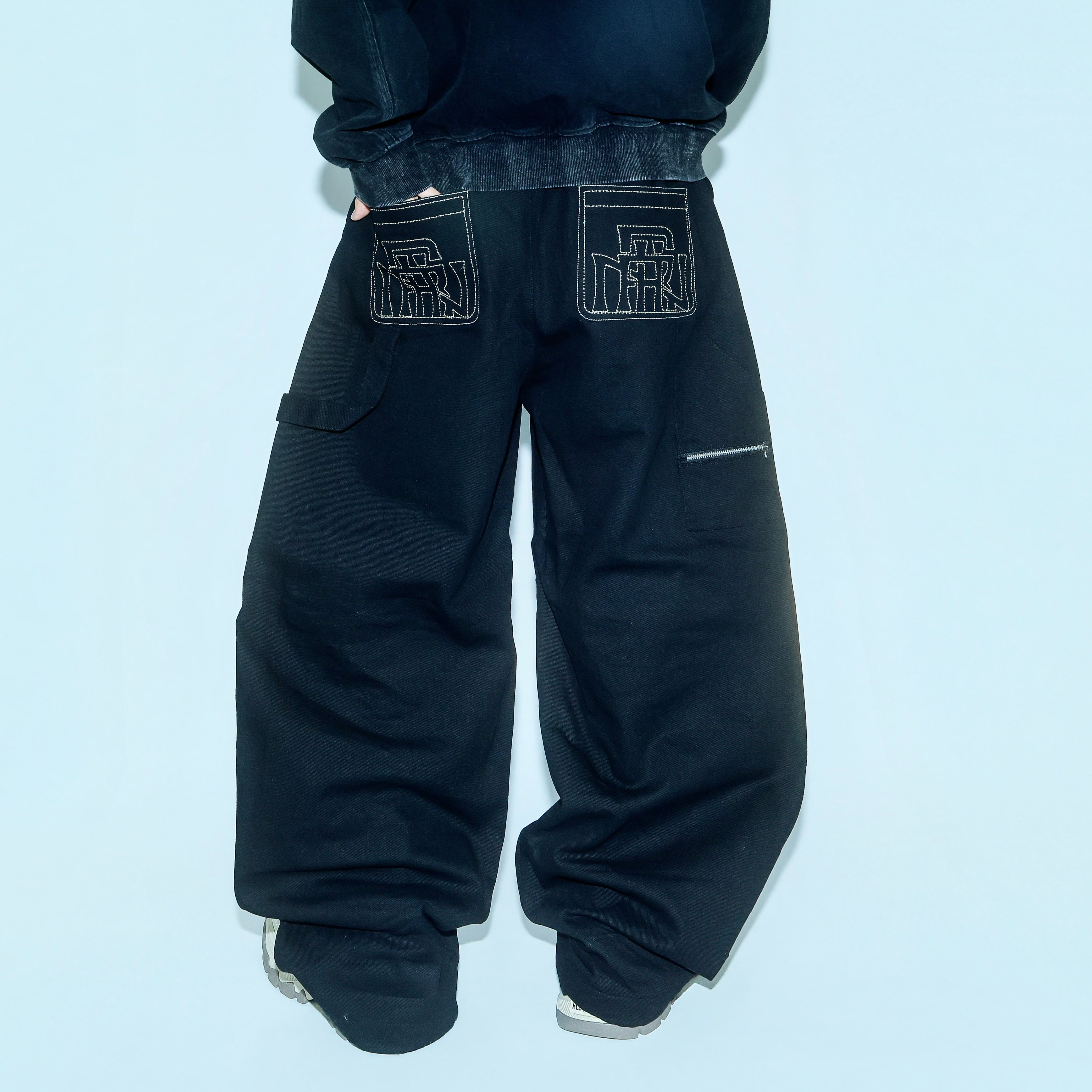 ・後ろポケットにロゴを刺繍したワイドパンツ。