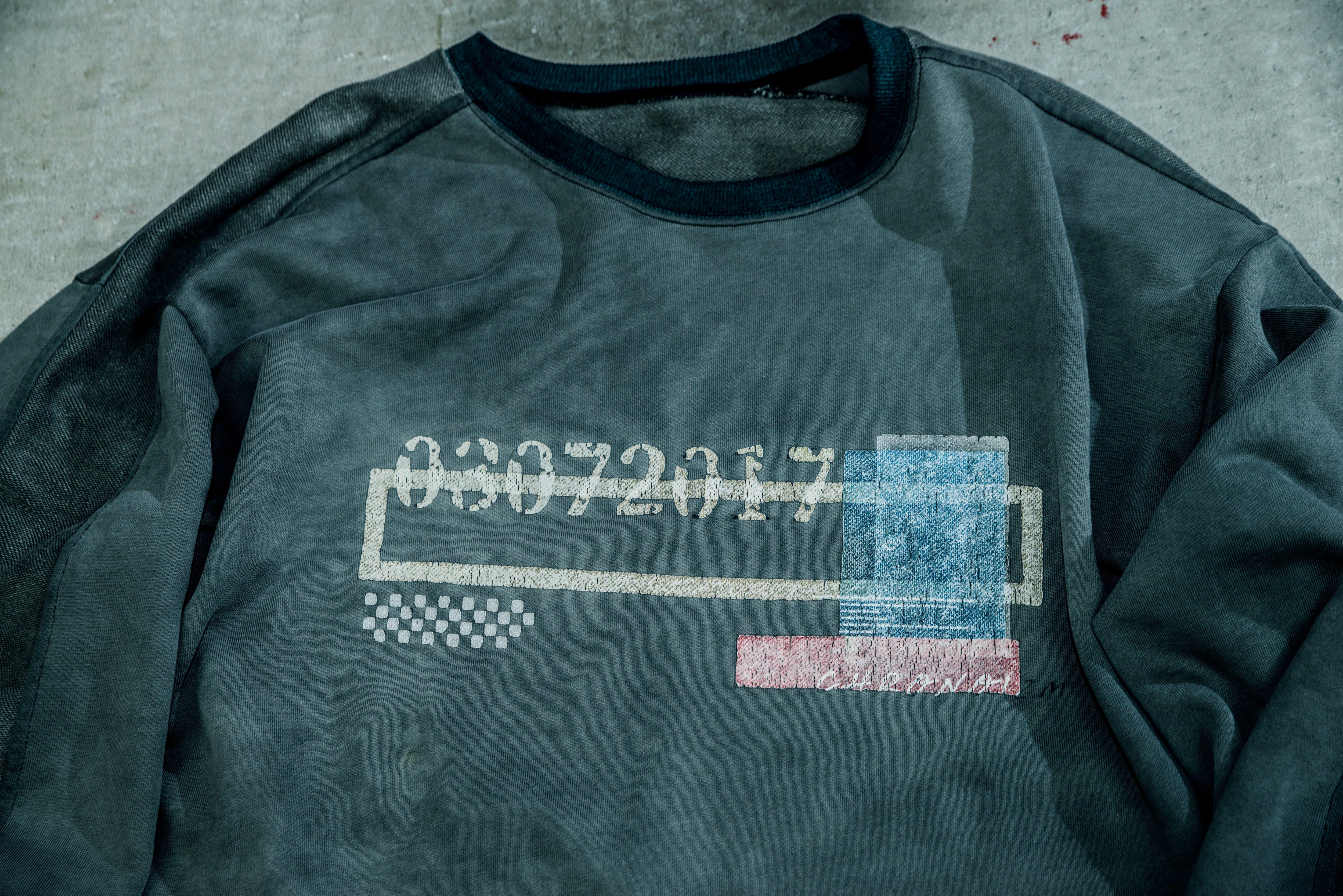 あえて転写プリント後にウォッシュをかけ、プリントの剥がれ感とボディのダメージ感を演出。繊細な加工が随所に散りばめられたアイテム。