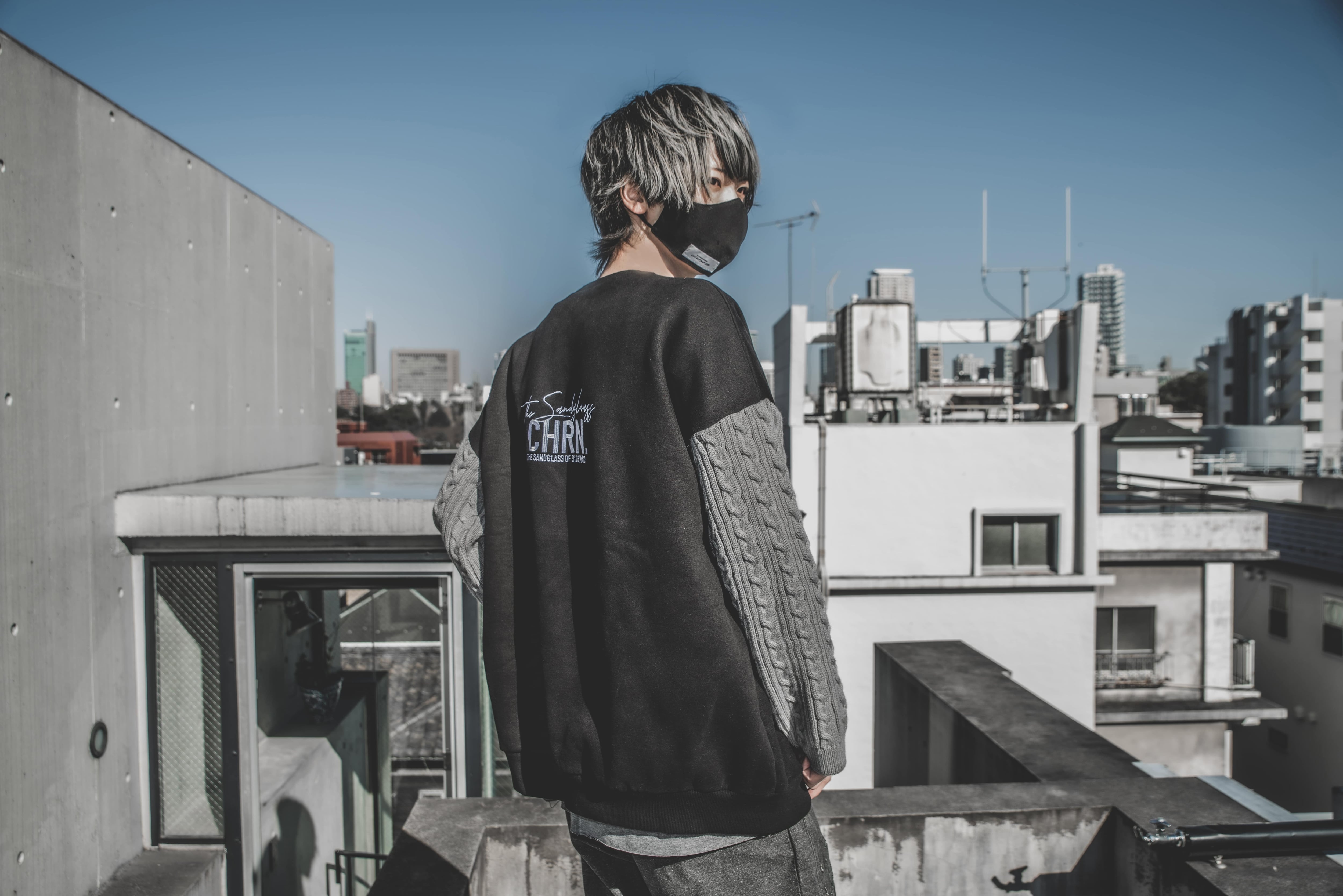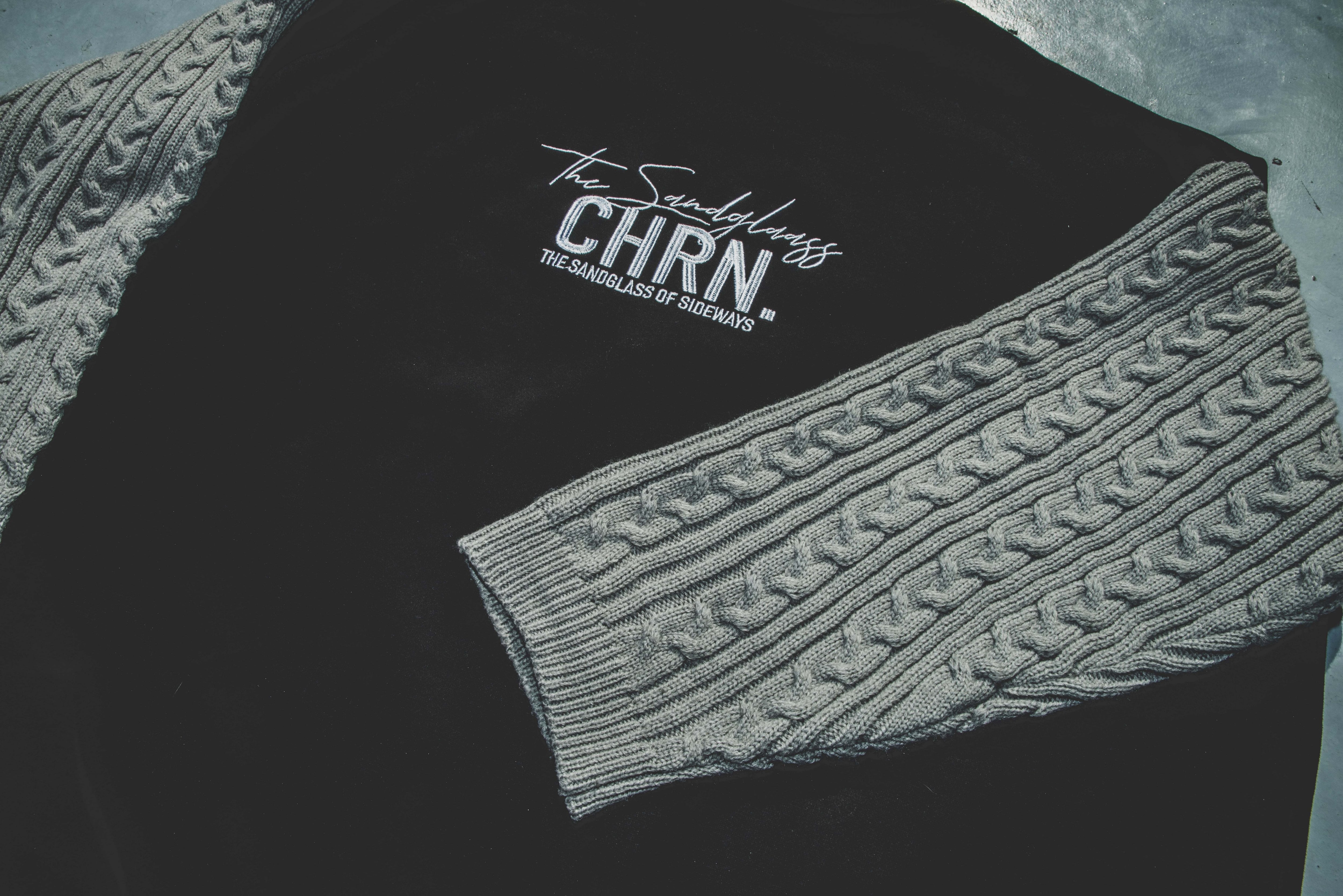 袖からケーブルニットに切り替えた薄手のスウェット。