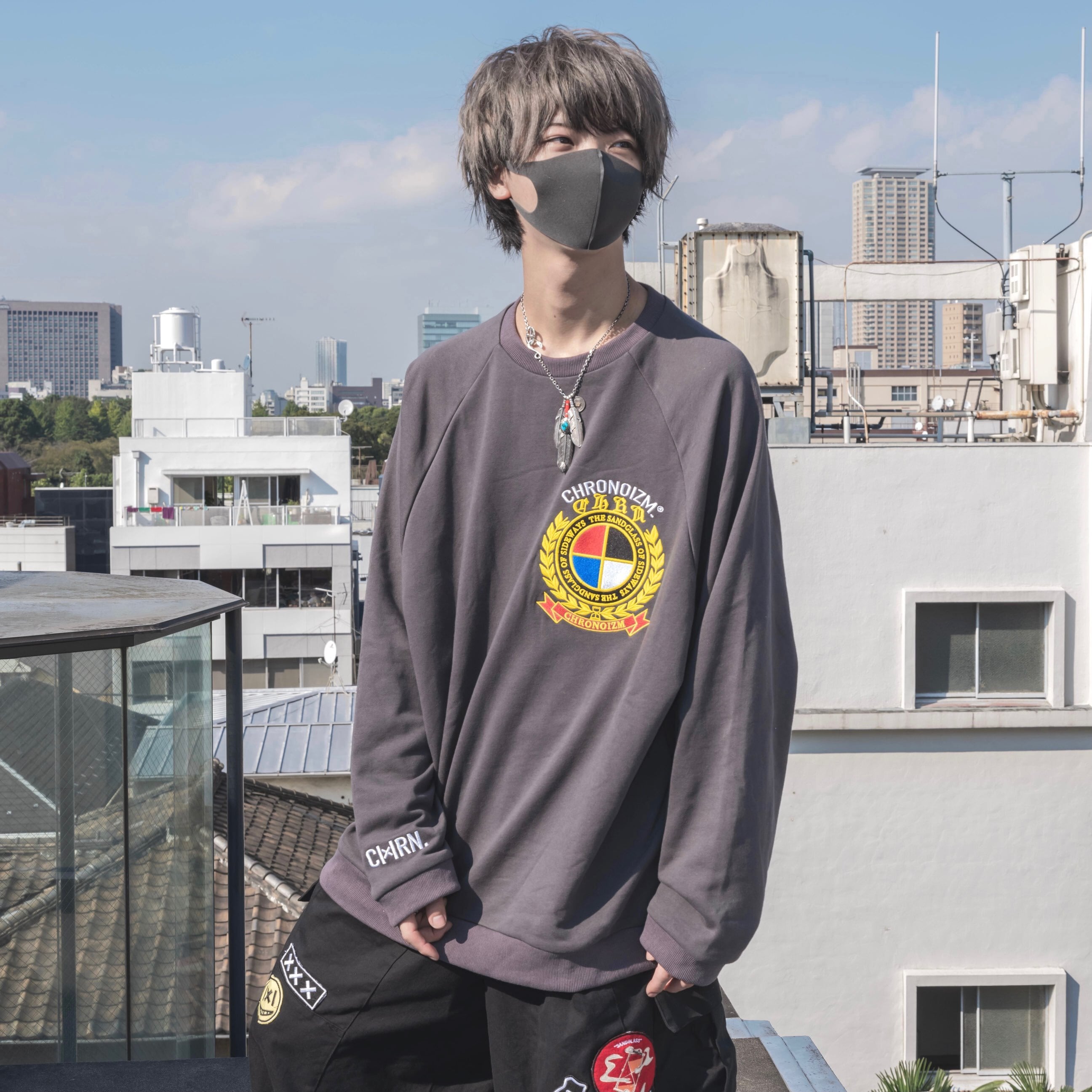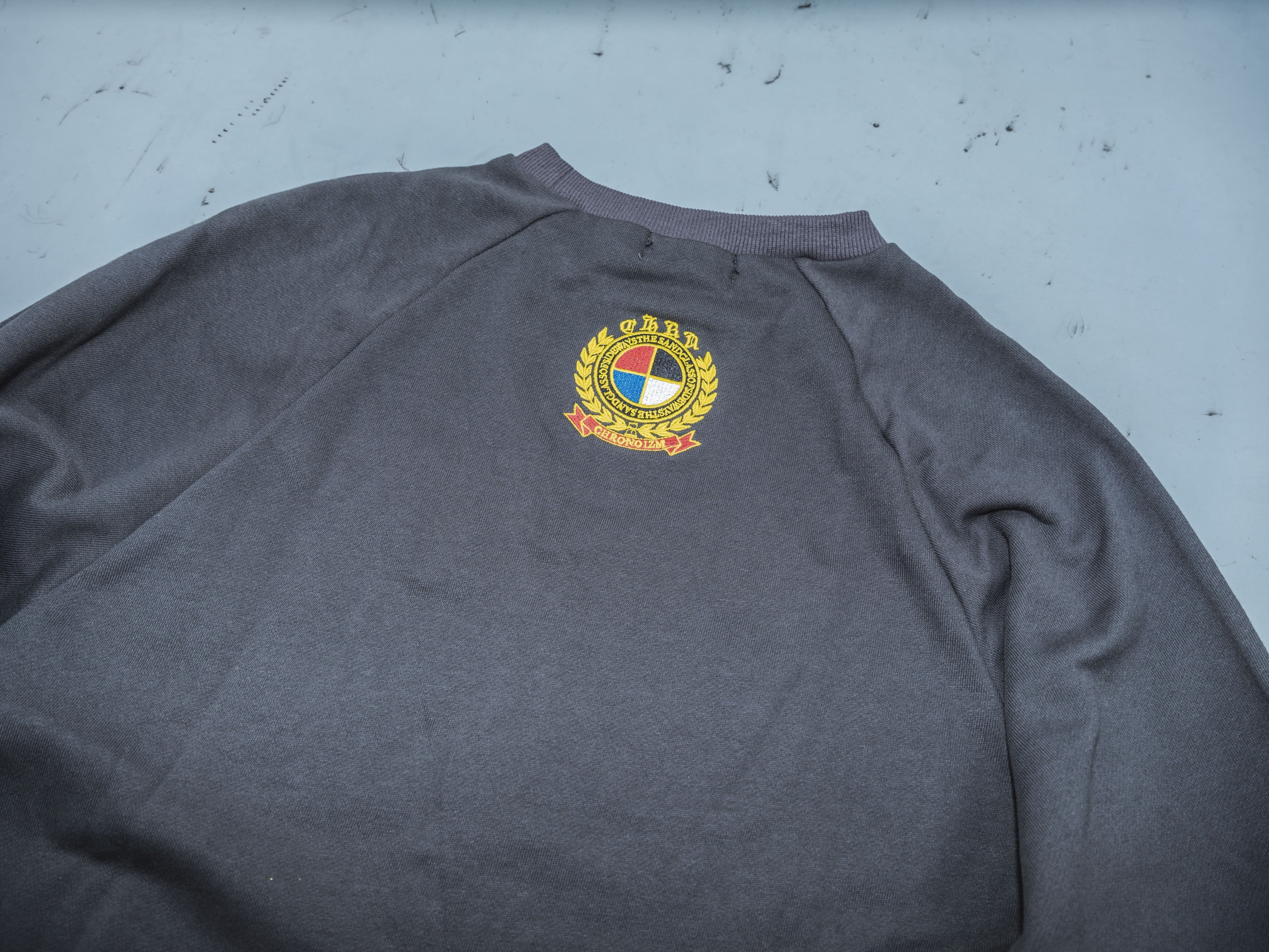 ・胸に特大サイズの刺繍を施したパイル地スウェット。