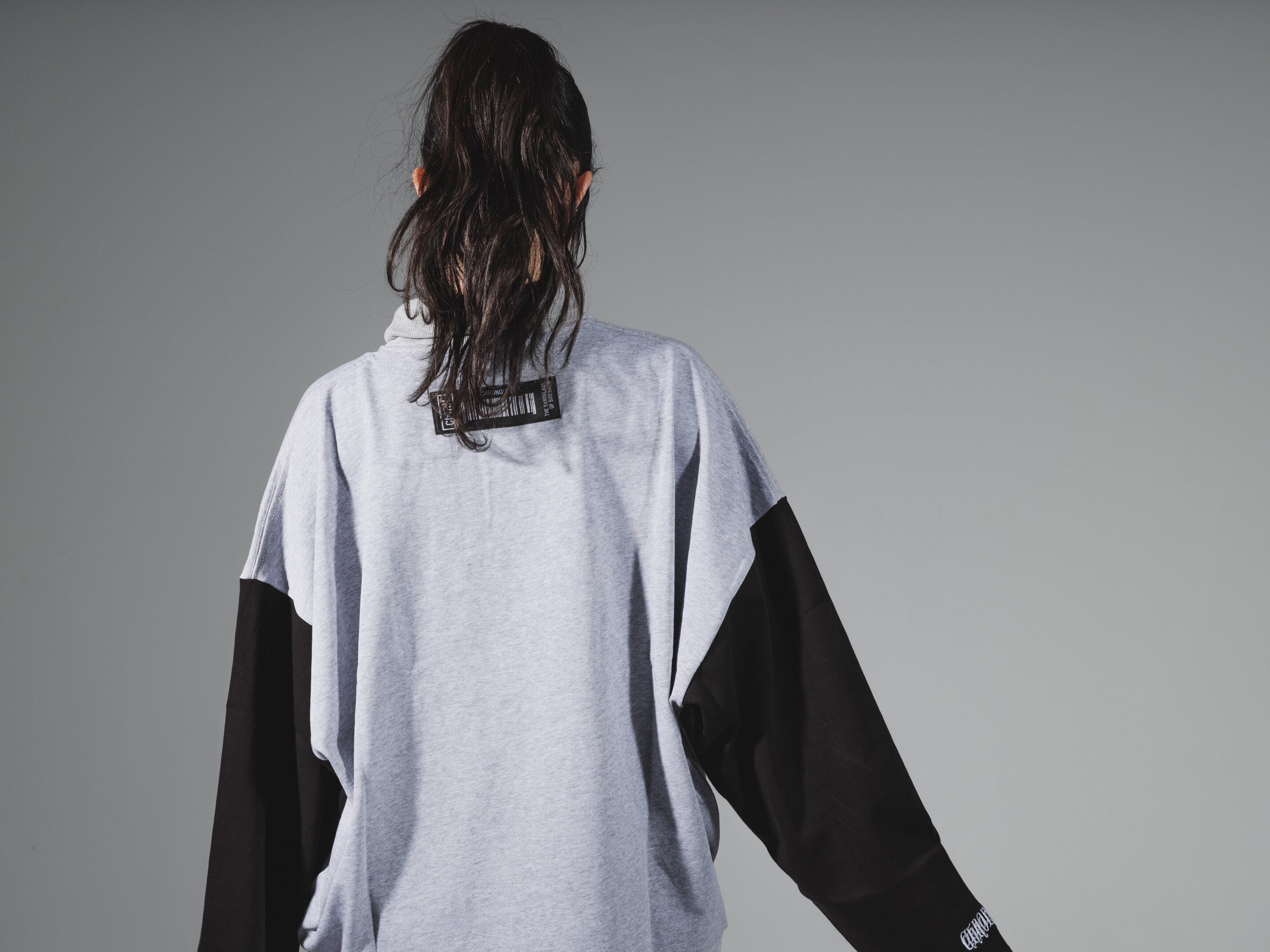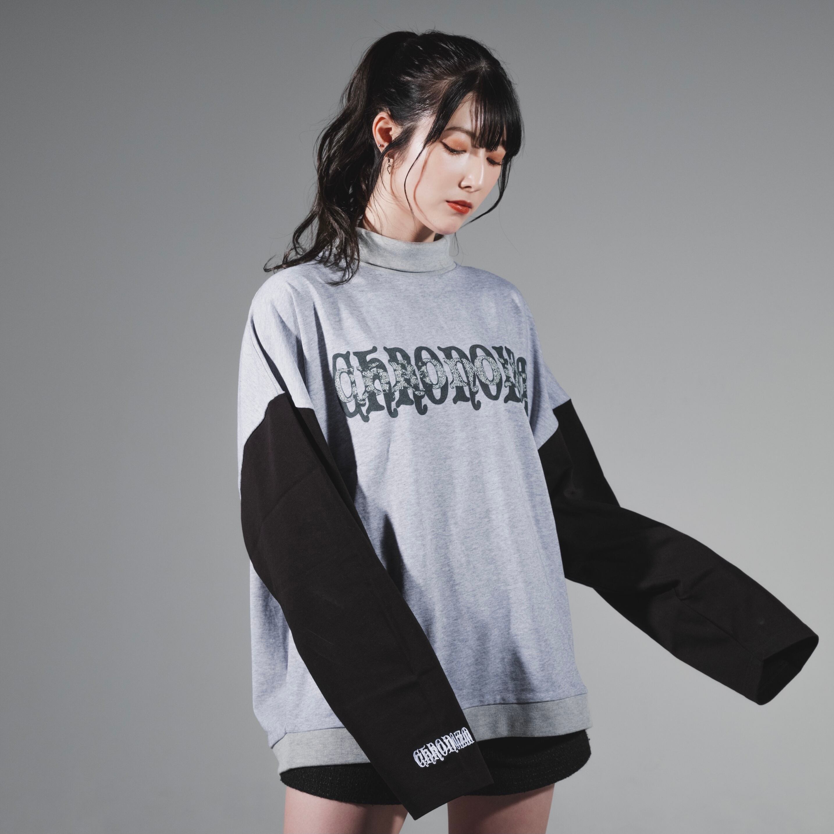 ・袖でグレーとブラックに切り替えたタートルネックロンT。
