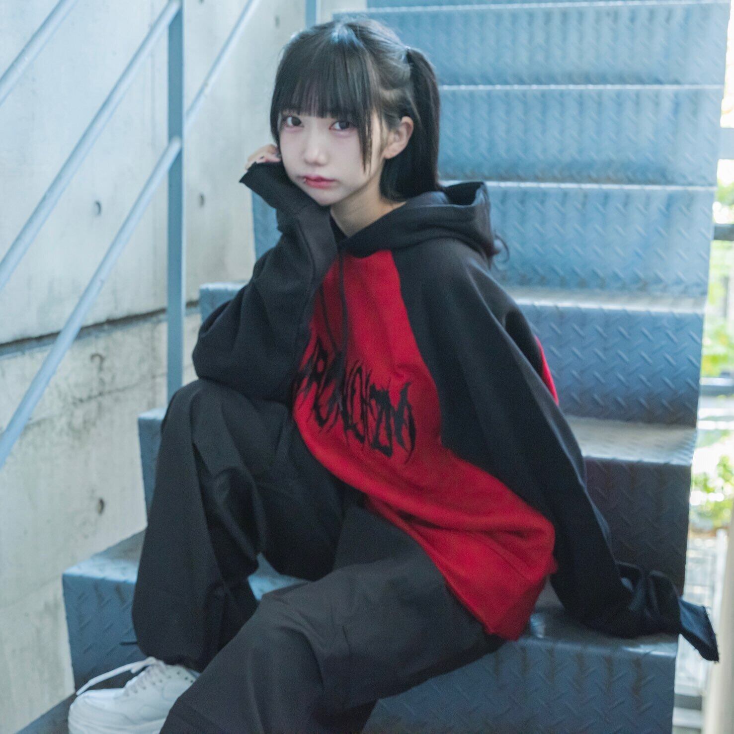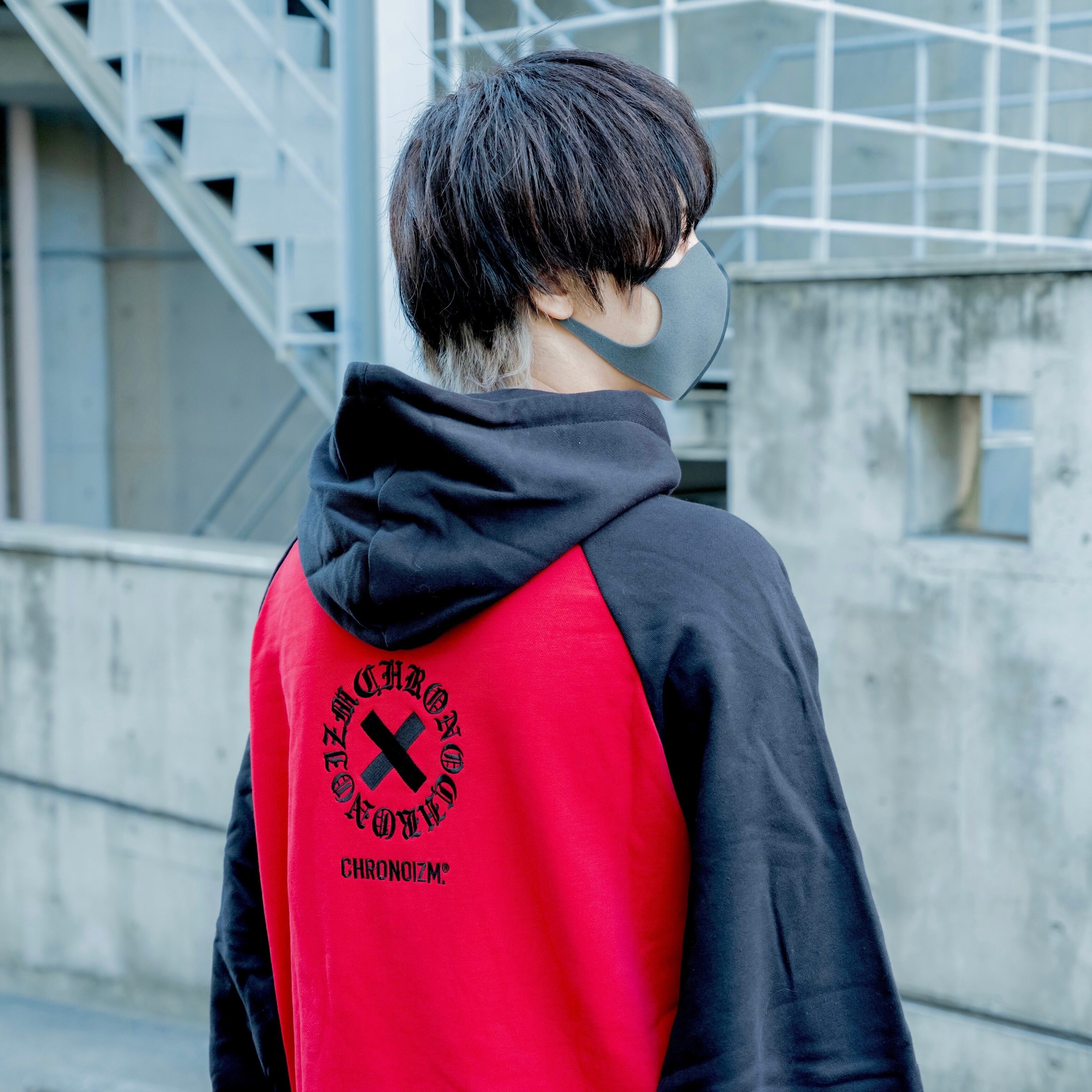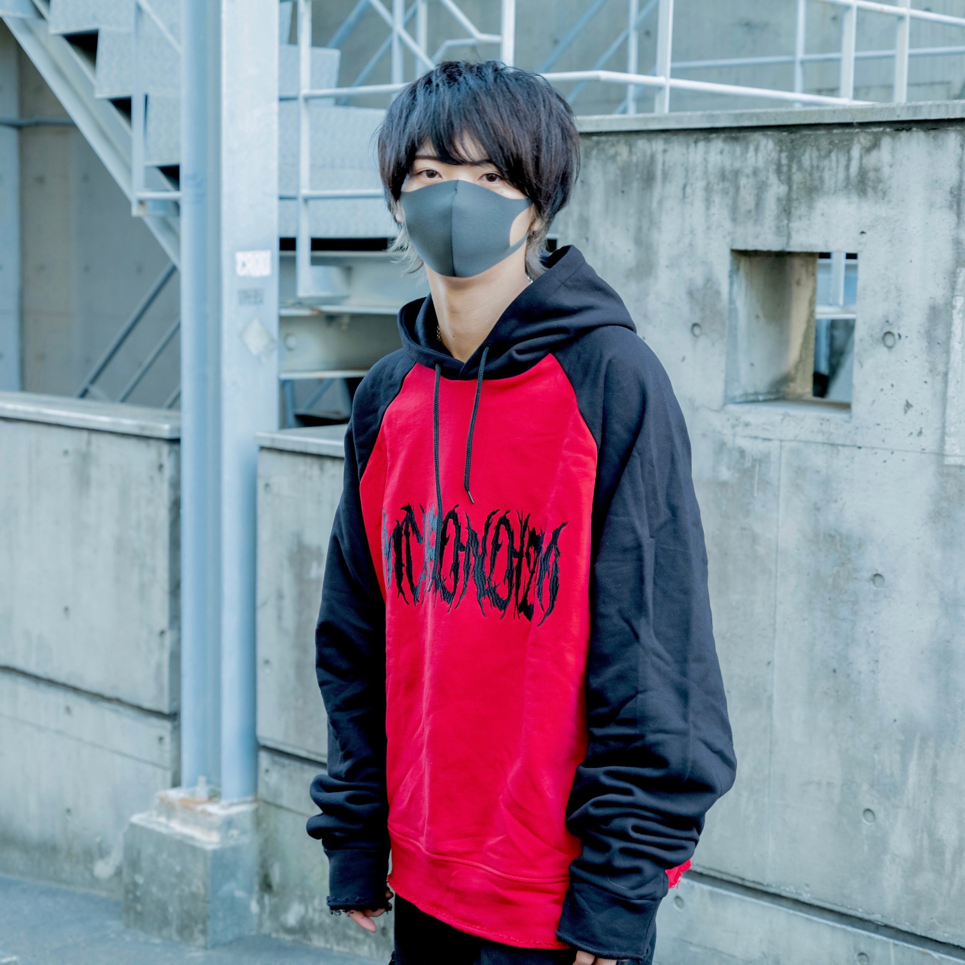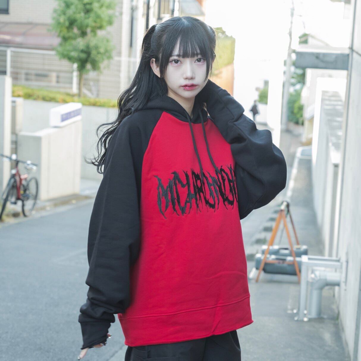 ・赤と黒の生地で切り替えたラグランタイプのパーカー。