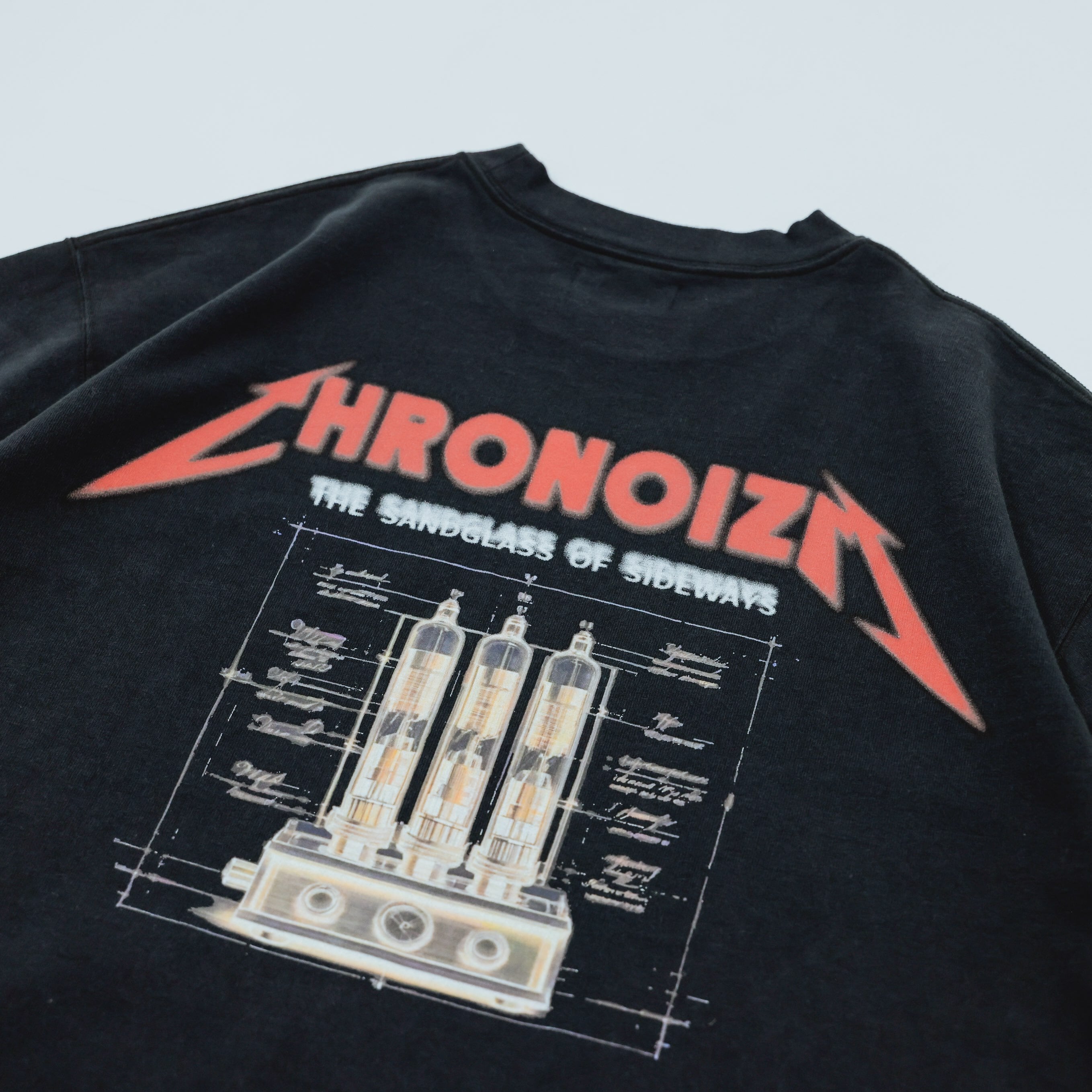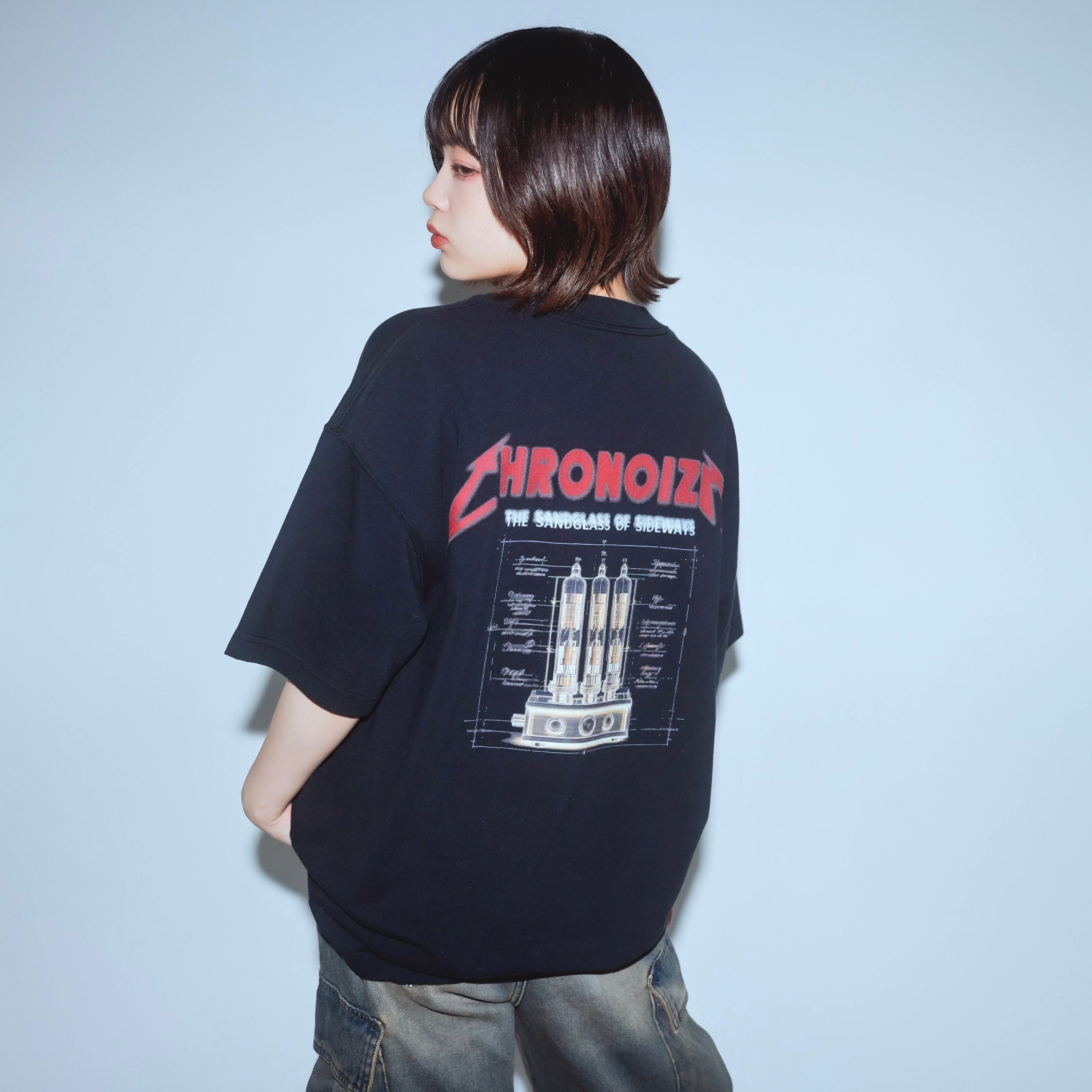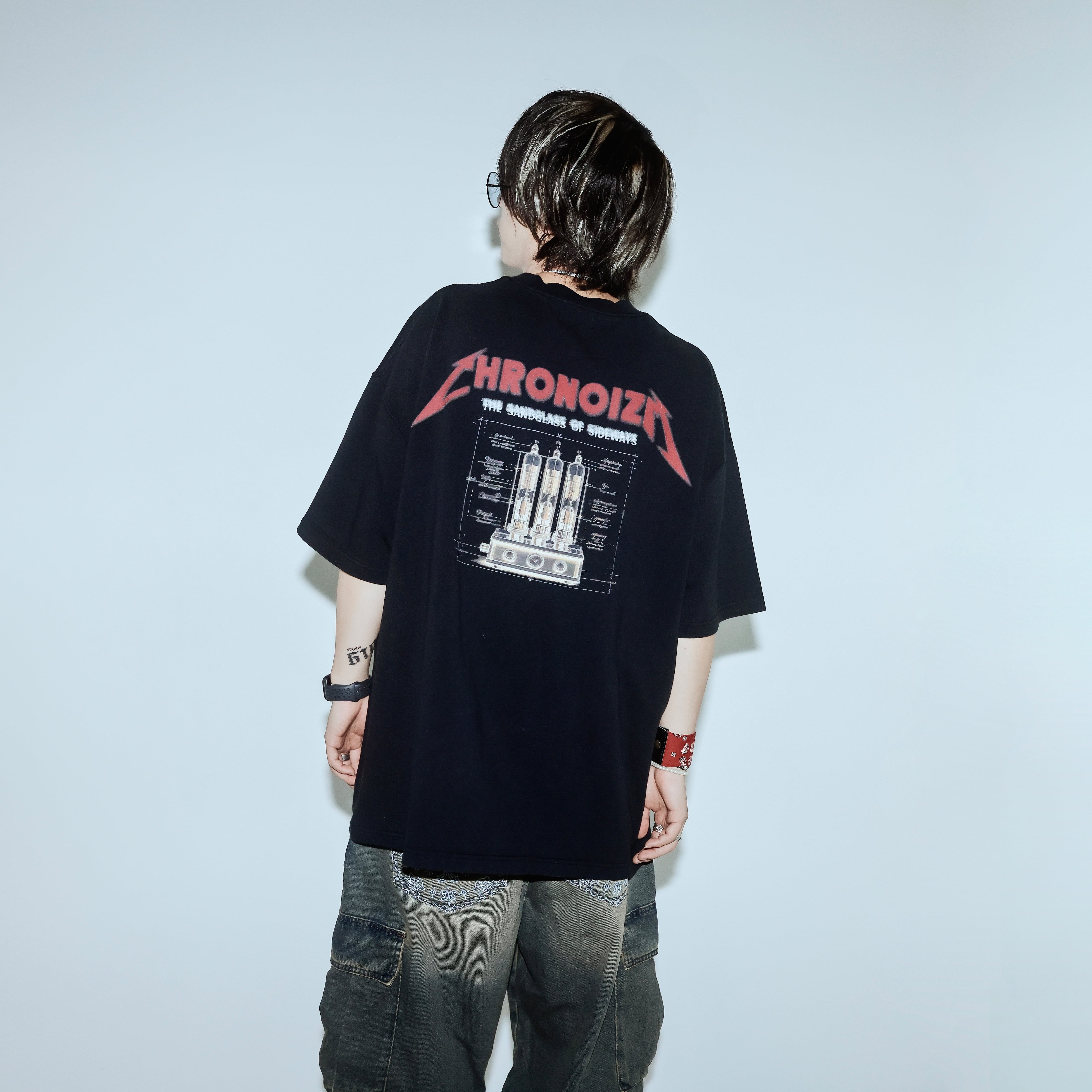 ・ニキシー管時計と、その設計図を模したデザインをプリントしたTシャツ。